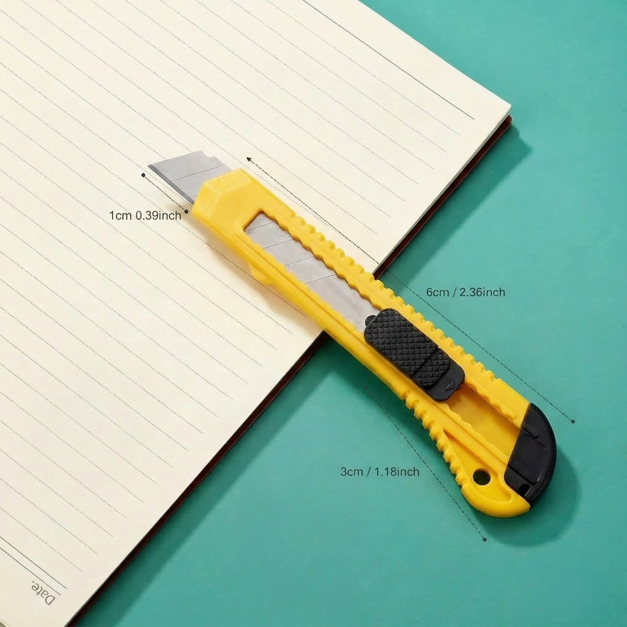 This versatile and lightweight utility knife is an essential tool for any toolbox, office, or crafting space. Designed for efficiency and accuracy, it features a durable yellow plastic body with a secure-grip texture, allowing for controlled cutting. The retractable metal blade is both reliable and precise, perfect for slicing through various materials.