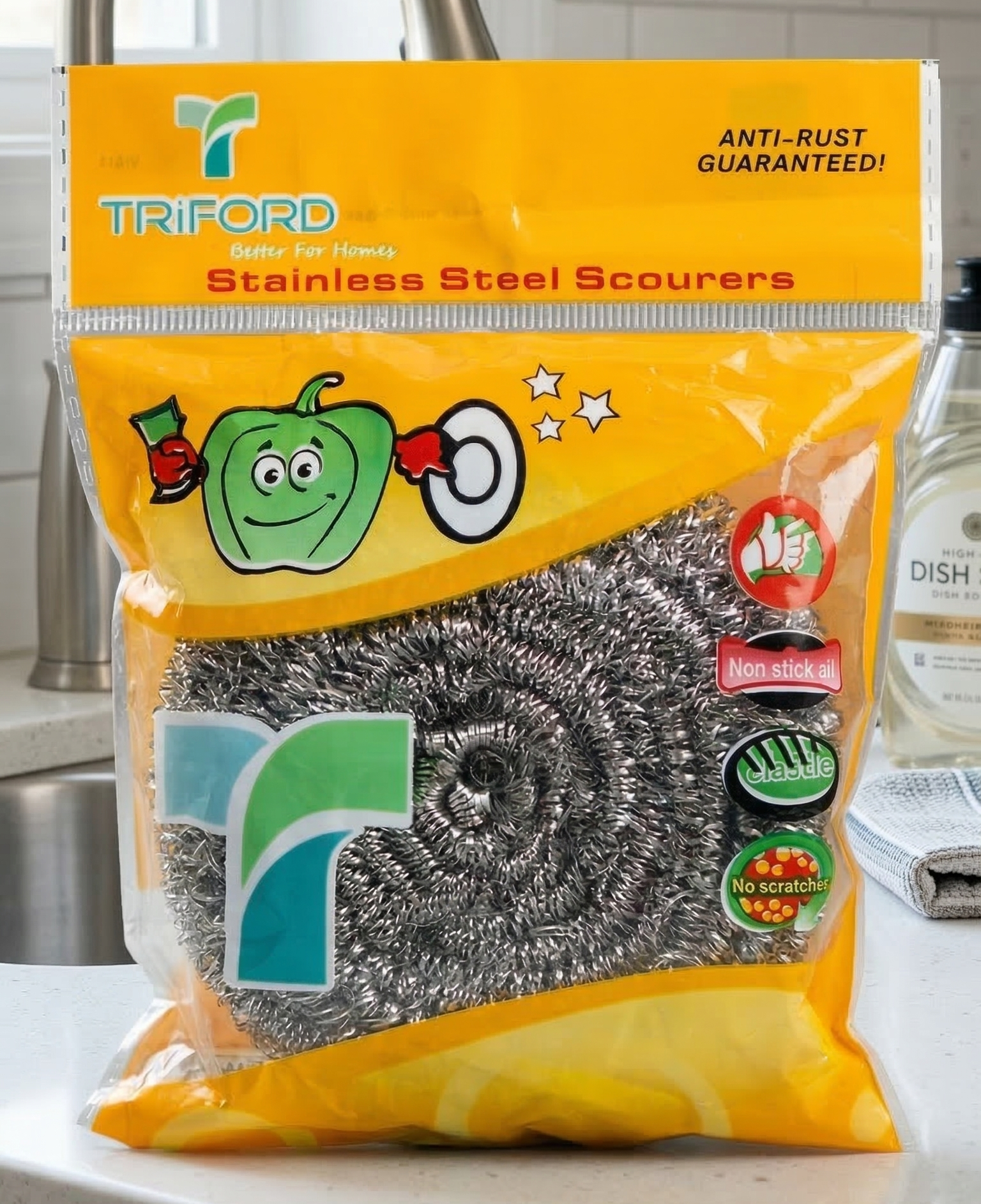 Experience the cleaning power of the Triford Stainless Steel Scourers, designed to make your toughest kitchen chores easier. This professional-grade scouring pad is built for maximum durability and unparalleled cleaning performance, ensuring your cookware and surfaces look as good as new.