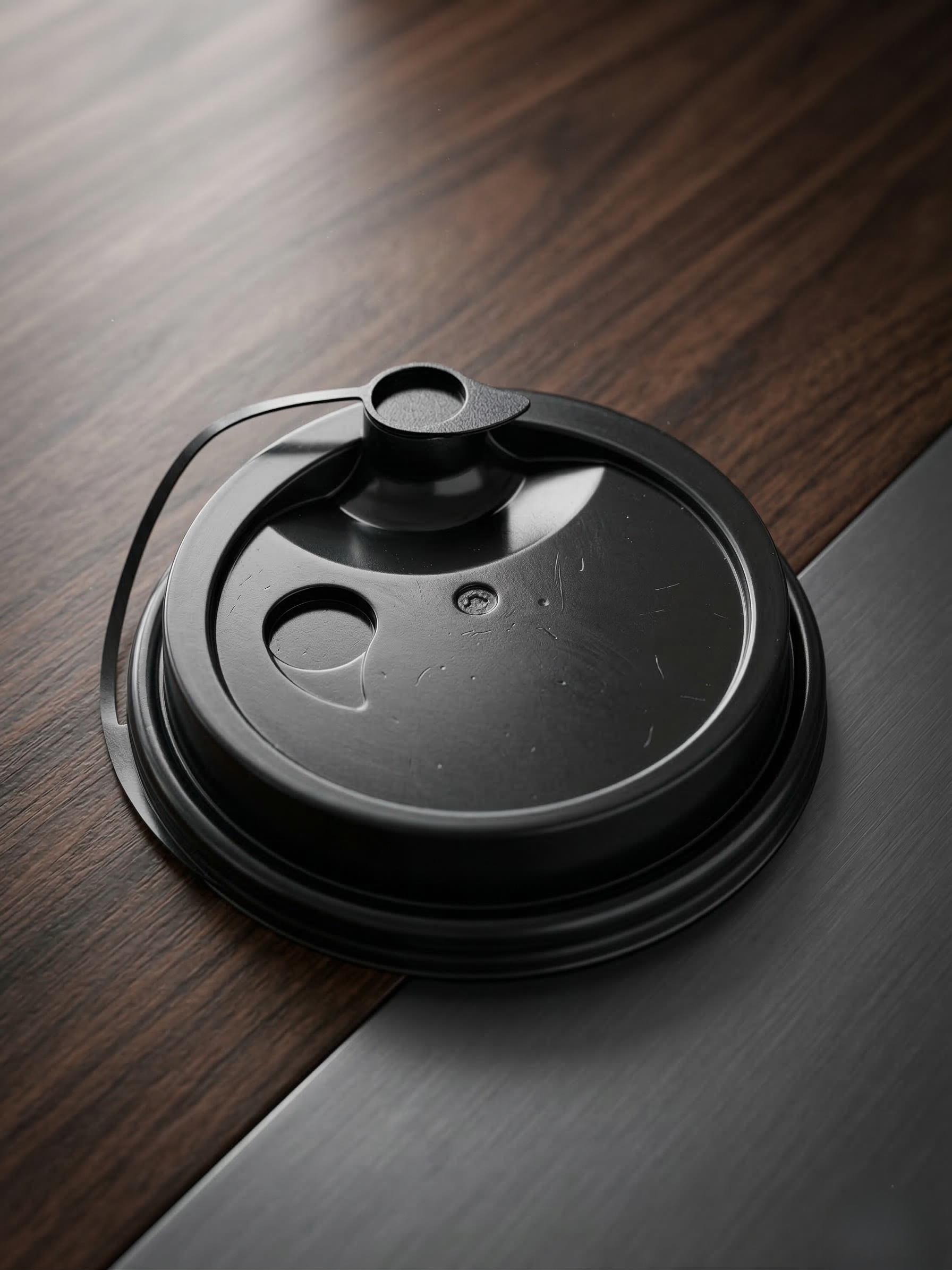 Industrial Stealth Lid: A deep-black, high-gloss lid featuring a dual-access design—perfect for high-flow sipping or use with a reusable straw.